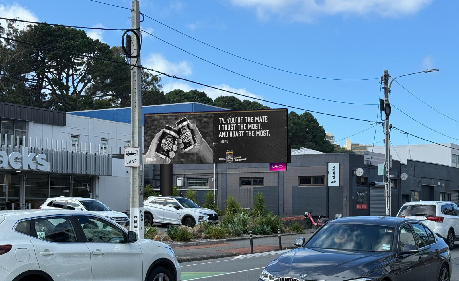 This campaign for Asahi’s Woodstock brand celebrated Kiwi mateship by transforming authentic “bromance” moments into a dynamic, nationwide digital out-of-home campaign. The concept centred on broadcasting heartfelt and humorous messages between friends, with each screen continuously rotating through the entire collection of curated shout-outs. To handle the variable length of each unique message, our bespoke JavaScript-based solution adjusted the text to fit perfectly within the creative’s boundaries, guaranteeing a polished look for every story shared.