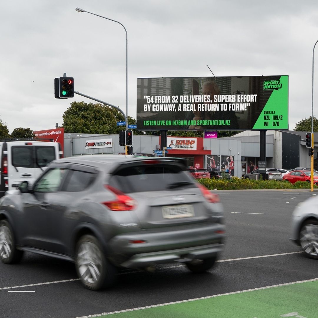 The Sport Nation Live Commentary campaign transformed roadside digital billboards into a real time sports feed, giving motorists a compelling reason to tune in. Leveraging Dynamic Creative Optimisation (DCO), we delivered live cricket scores for BLACKCAPS matches, paired with dynamic sound bites from Sportnation’s award winning commentary team. This innovative approach ensured the message was always current and contextually relevant to listeners on the move.